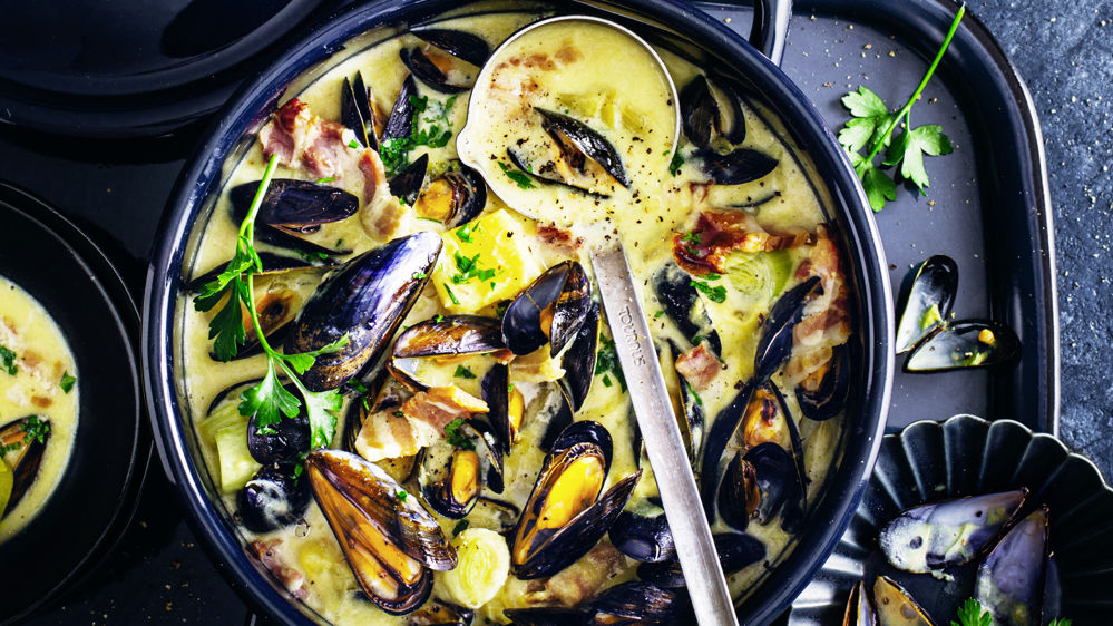 4. À l’aide d’un pied mixeur, mixez grossièrement la soupe en gardant des morceaux. Ajoutez la crème, le safran, le jus de moule et les moules. Mélangez et laissez réchauffer à feu doux les moules pendant encore 5 minutes. Ajoutez le persil et servez.