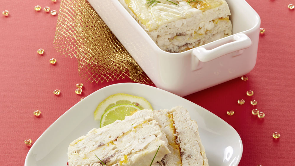 6. Dans une terrine beurrée (ou silicone), placez les bandes de mulet, des tranches de haddock, puis la farce. Réalisez cette opération trois fois.