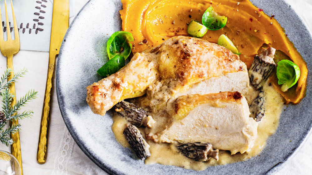 5. Servez avec par exemple une purée de potimarron et des choux de Bruxelles cuits à l’eau.