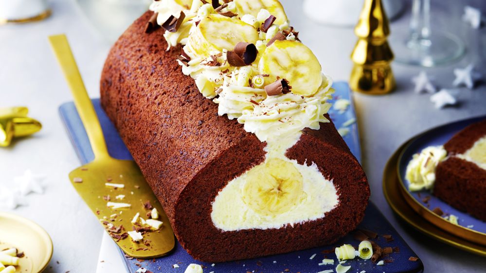 7. Épluchez les bananes, recoupez-les pour ne garder que les parties droites et arrosez de jus de citron. Alignez-les au centre du biscuit, puis rabattez les deux côtés du biscuit sur les bananes en utilisant le papier cuisson. Placez 30 minutes au réfrigérateur puis décorez le dessus avec la crème restante et des rondelles de banane restante.