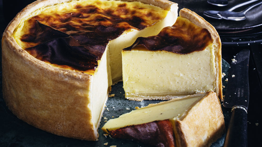 7. Versez la crème sur la pâte congelée, lissez le dessus à l’aide d’une cuillère trempée dans l’eau chaude. Enfournez pour 40 minutes à 180°C puis 5 minutes à 210°C pour colorer le dessus du flan. À la sortie du four, celui-ci doit être bien tremblotant. Laissez tiédir et placez au réfrigérateur au minimum 4 heures, ou une nuit dans l’idéal.