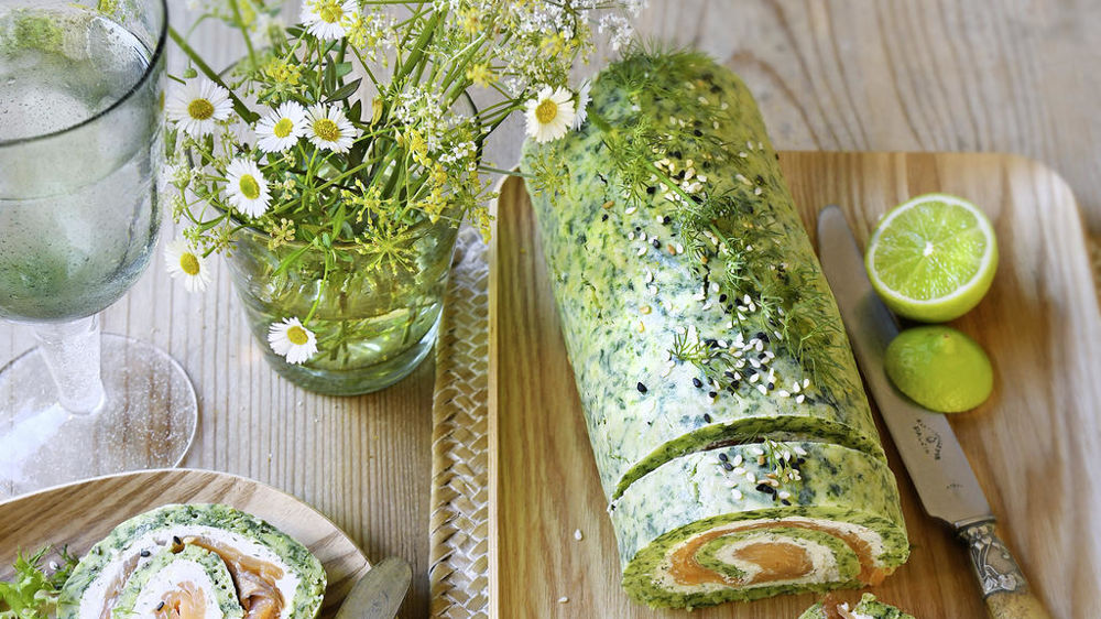 4. Hachez finement l’aneth et l’échalote, pressez l’autre gousse d’ail et mélangez le tout au fromage frais. Salez, poivrez généreusement. Étalez cette préparation sur l’omelette aux épinards, recouvrez de truite fumée et roulez bien serré dans un film alimentaire.