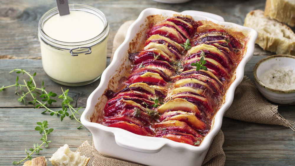3. Dans un plat à gratin légèrement huilé, disposez les légumes en rang serré en alternant les légumes. Ajoutez le bouillon de volaille. Versez la cancoillotte à l’ail, parsemez de thym. Salez et poivrez.