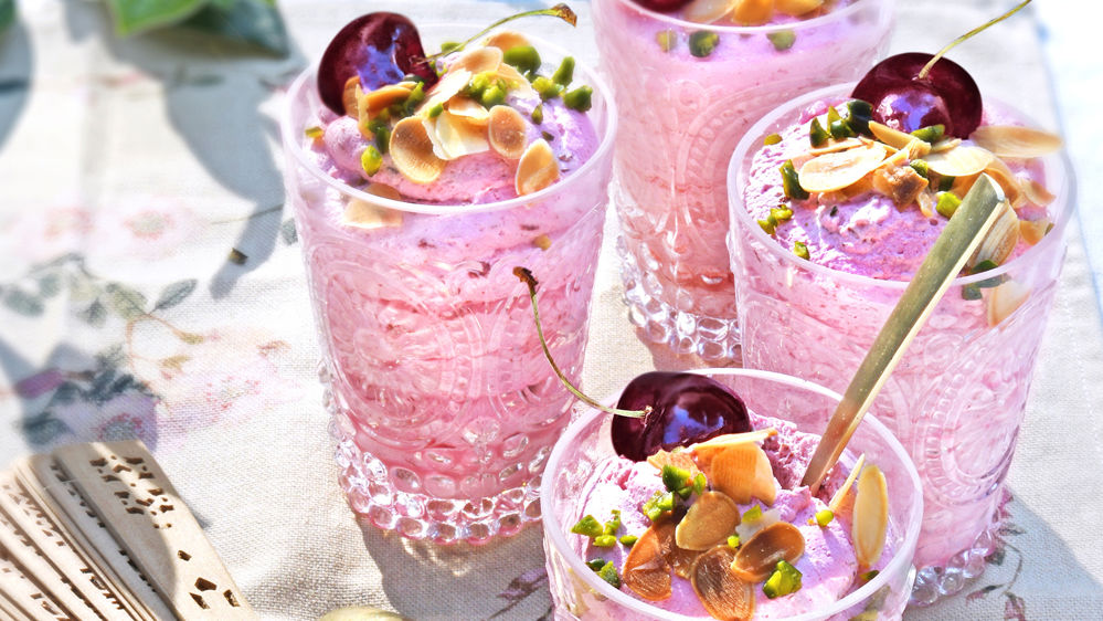 Mixez 300 g de cerises dénoyautées, 40 g de sucre et le jus d’un demi-citron. Détendez 6 g de gélatine dans de l’eau froide. Faites chauffer légèrement dans une casserole un tiers de la purée de fruits. Hors du feu, ajoutez la gélatine essorée, mélangez bien pour qu’elle fonde. Versez alors dans le reste de purée froide, mélangez et placez 30 minutes au réfrigérateur. Montez 300 g de crème fraîche entière au batteur. Ajoutez la purée, en 3 fois, délicatement. Versez dans quatre verrines et réservez 4 h au frais.