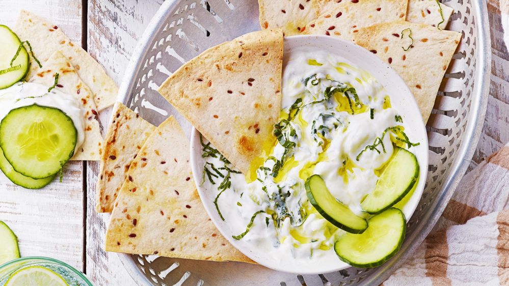 Pressez le concombre entre vos mains pour ôter le maximum d’eau. Mettez-le dans un saladier, ajoutez 300 g de yaourt grec épais, la sauce au citron et un demi-bouquet de feuilles de menthe ciselées. Poivrez, salez si besoin et mélangez.