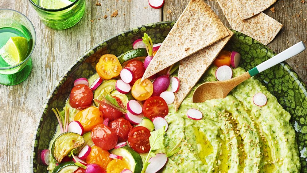 7. Versez le houmous obtenu dans un plat, ajoutez les courgettes restantes, les tomates rôties, les tomates cerises crues et les radis. Arrosez d’un filet d’huile d’olive et parsemez de graines de sésame.