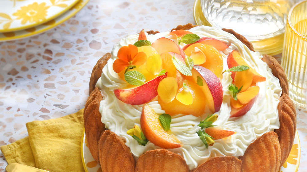 9. Coupez la bosse de chaque madeleine et collez-les aussitôt sur la crème tout autour du gâteau. Mettez le reste de crème dans une poche à douille, décorez le dessus du gâteau et déposez des fruits sur le dessus, ajoutez les fleurs et les feuilles de menthe. Réservez au frais avant de servir.