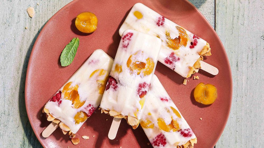 Mélangez 500 g de yaourt grec et 8 cuillères à soupe de sirop d’érable. Lavez 15 mirabelles de Lorraine, coupez-les en deux et dénoyautez-les. Répartissez équitablement le yaourt, les mirabelles et 200 g de framboises dans quatre moules à esquimaux en alternant yaourt et fruits. Terminez par du yaourt sans remplir jusqu’en haut.