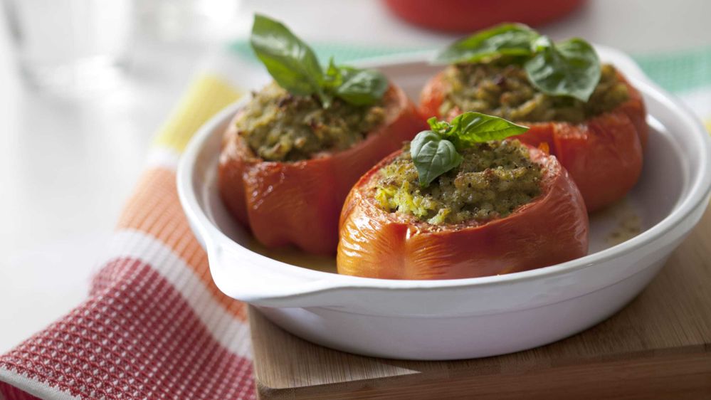 5. Garnissez les tomates avec le risotto. Réchauffez 8 à 10 minutes au four à 180°C. Décorez de basilic frais avant de servir.