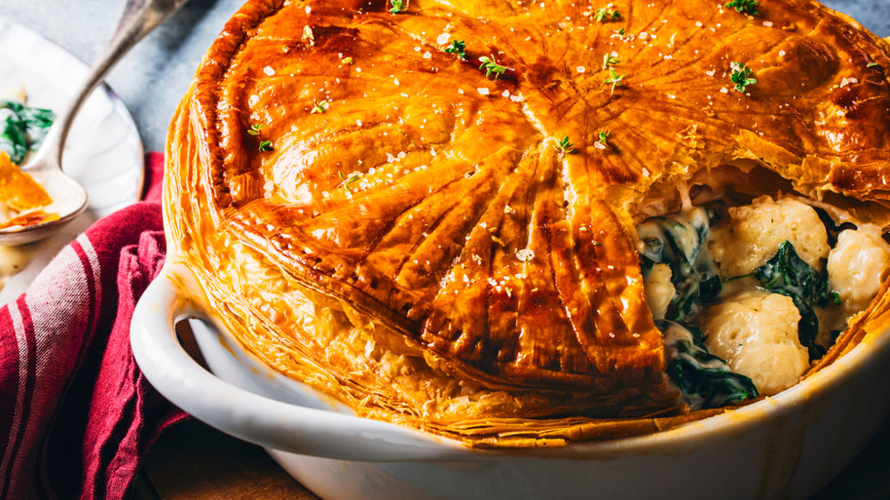 6. Badigeonnez le bord du plat d’un peu d’œuf battu et recouvrez de la pâte feuilletée bien froide découpée au diamètre du plat. Pincez les bords pour souder la pâte, décorez le dessus avec la pointe d’un couteau et badigeonnez d’œuf battu. Enfournez pour 30 minutes et servez sans attendre.