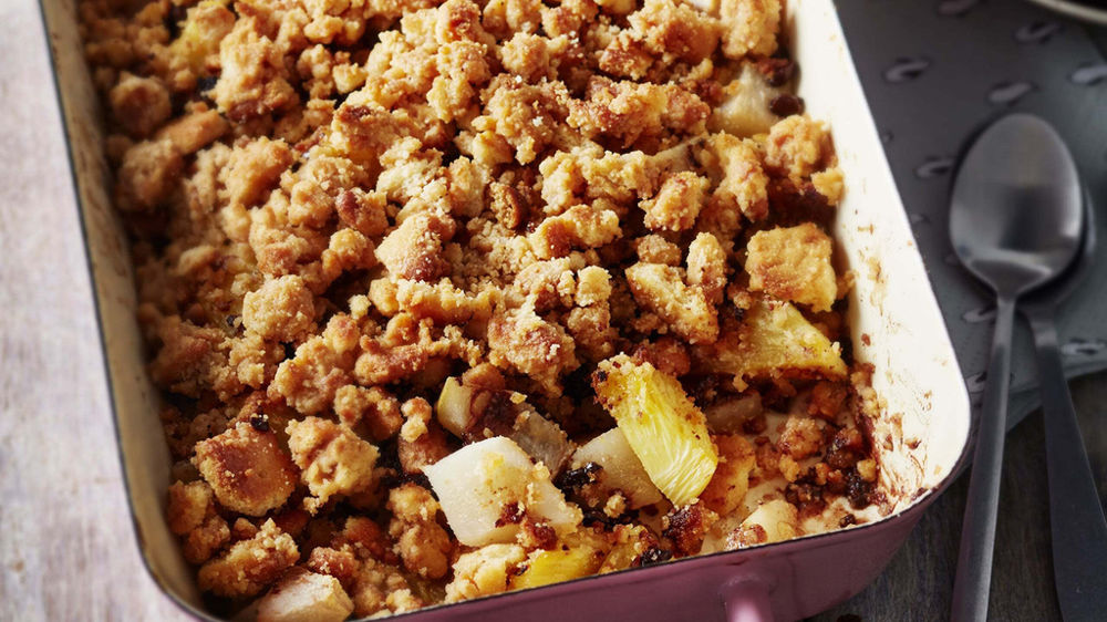 4. Pelez les poires. Coupez-les en dés. Disposez-les dans un plat à gratin. Nappez de miel. Éparpillez les miettes de crumble au-dessus des poires.