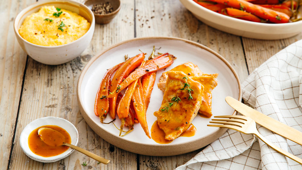 9. Servez la viande nappée de sauce filtrée au chinois, accompagnée de polenta crémeuse et carottes fondantes.