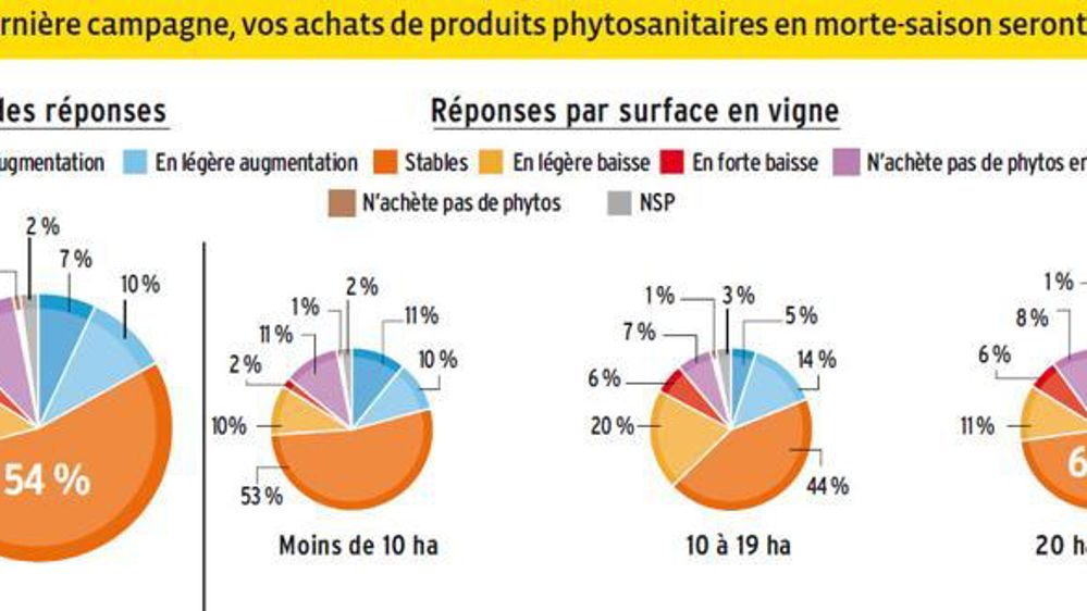 Près d’un quart des exploitations de moins de dix hectares vont augmenter leurs achats de phytos en morte-saison. À l’inverse, 26 % des vignobles de 10 à 19 hectares vont diminuer leurs achats durant cette période. Les viticulteurs qui ont plus de 20 hectares sont ceux qui vont garder le plus de stabilité dans leur approvisionnement en morte-saison. 63 % d’entre eux vont effectuer les mêmes achats qu’en 2015.