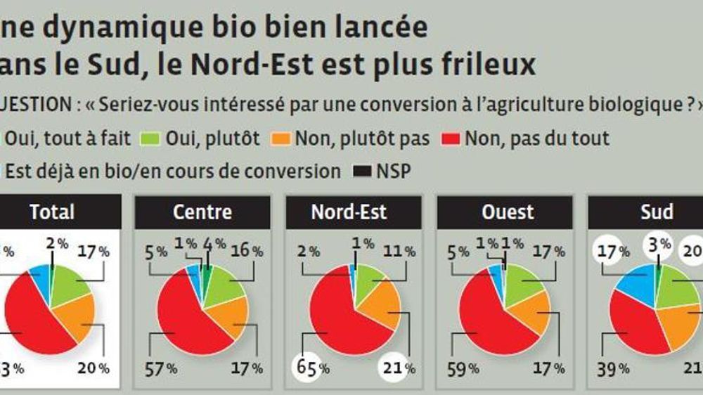 Les agriculteurs du Nord-Est sont les plus frileux à l’idée de convertir leur exploitation, puisque 65 % des interrogés ne veulent « pas du tout », et 21 % ne veulent « plutôt pas » sauter le pas. Seuls 2 % du panel sont d’ores et déjà bio. L’intérêt pour une production plus « verte » s’accroît en descendant dans le sud de l’Hexagone, puisqu’au total 60 % des interrogés ont répondu par la négative.