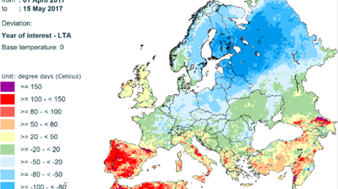 Dans son bulletin du 22 mai 2017, l’observatoire Mars des ressources agricoles de la Commission européenne revient sur les conditions météorologiques de la période allant du 1er avril au 15 mai 2017.