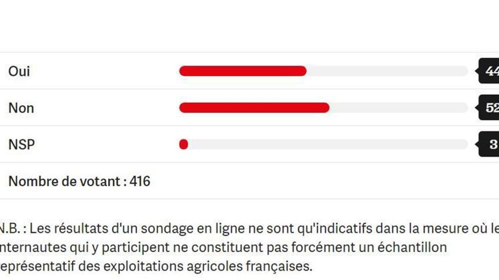 N.B. : Les résultats d’un sondage en ligne ne sont qu’indicatifs dans la mesure où les internautes qui y participent ne constituent pas forcément un échantillon représentatif des exploitations agricoles françaises.