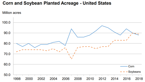 Surfaces de soja et de maïs aux États-Unis, en millions d’acres. Source : USDA