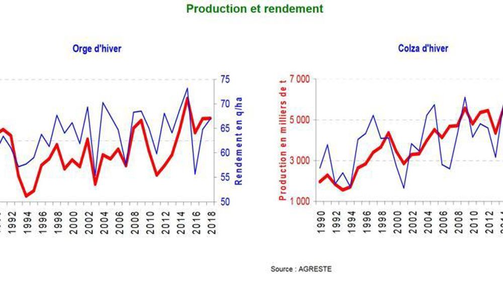 Le tableau est moins noir pour les orges d’hiver : la production augmenterait de 0,2 % sur un an, et de 4,9 % par rapport à la moyenne de 2013 à 2017. Malgré une baisse des surfaces de 3 % généralisée sur toute la France, les rendements sont à la hausse (+3,2 %). De manière hétérogène cependant : +6,5 % en Lorraine, +1 % dans le Centre, –0,8 % en Bretagne, par exemple.