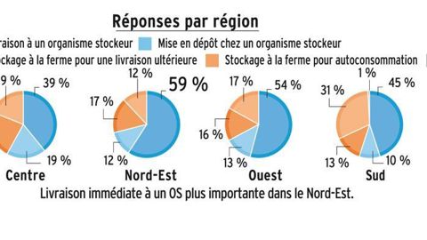 C’est dans le nord-est de la France que les agriculteurs sont les plus nombreux, 59 %, à prévoir une livraison directe à un organisme stockeur. Ceux du Sud privilégieront le stockage à la ferme pour une livraison ultérieure (13 %) ou pour l’autoconsommation (31 %).