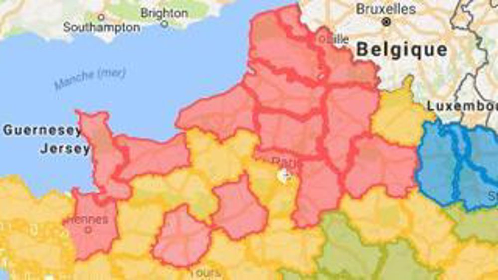 Légende des rendements ==> Rouge : 41 q/ha et plus, jaune : de 36 à 40 q/ha, vert : de 31 à 35 q/ha, bleu foncé : de 26 à 30 q/ha, bleu clair : 25 q/ha et moins. Source : Prévision Agreste au 1er septembre.