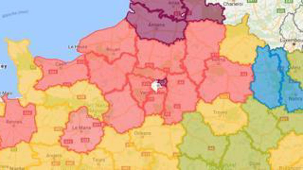 Légende des rendements ==> Violet : + de 80 q/ha, rouge : de 70 à 79 q/ha, jaune : de 60 à 69 q/ha, vert clair : de 50 à 59 q/ha, bleu foncé : de 40 à 49 q/ha, bleu clair : moins de 40 q/ha. Source : Prévision Agreste au 1er septembre.