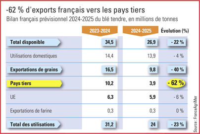 En France, avec la chute de la production (25,6 Mt), les exportations sont prévues en forte baisse pour la campagne de 2024-2025 (lire le graphe). De 16,6 Mt l’an passé, elles chuteraient de 40 % pour passer sous la barre des 10 Mt (9,9 Mt) cette campagne. Les mouvements vers les pays tiers connaîtraient une baisse de 62 %, à 3,9 Mt. Ceux vers l’UE sont attendus à 5,9 Mt (–6 %).