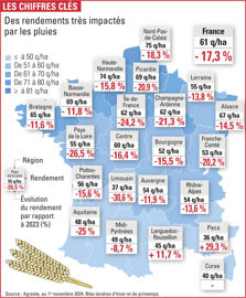 En Europe, la production chute de 10 %, à 112,9 Mt, contre 125,5 Mt en 2023. Outre la France, la production baisse aussi notamment en Allemagne, en Pologne et en Hongrie. En revanche, la production mondiale à 794,7 Mt selon l'USDA, est en hausse par rapport à la moyenne quinquennale (778 Mt). En Argentine et en Australie, la collecte est attendue en forte hausse.