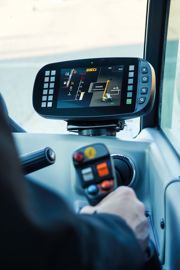La porte latérale évolue également avec un design revu qui, selon le constructeur, améliore l’accès en cabine et renforce l’isolation acoustique. Du côté de la visibilité, l’opérateur bénéficie d’une grande surface vitrée et surtout d’une caméra de recul intégrée. La sécurité de l’opérateur n’a pas été oubliée, avec la présence de témoins antirenversement, spécialement programmés.