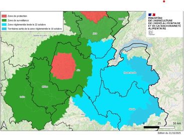 Le ministère de l’Agriculture le confirme, 45 jours après le dernier dépeuplement des foyers de dermatose nodulaire (DNC) confirmés dans les Savoies (Savoie, Haute-Savoie, et Ain), la zone réglementée est levée. Dans un communiqué de presse diffusé ce mercredi 22 octobre 2025, le cabinet d’Annie Genevard fait savoir le passage en « zone vaccinale » de l'ensemble de cette zone réglementée. Ce changement « facilite les mouvements de bovins entre cette zone et la zone indemne », explique le communiqué.