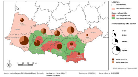 Une zone n’est considérée comme vaccinée, selon la réglementation européenne, que lorsque 95 % des élevages représentant 75 % des bovins de la zone ont été vaccinés : un seuil atteint dans les départements de l’Ariège et des Pyrénées-Orientales.