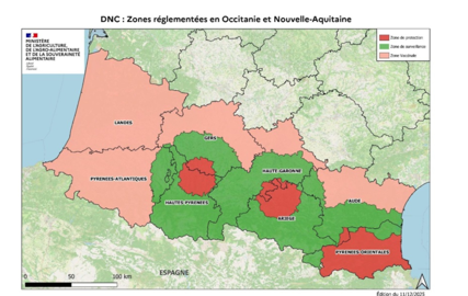 Selon le ministère de l’Agriculture, 116 foyers de DNC ont été détectés en France au total depuis le 29 juin 2025 : en Haute-Savoie (44), en Savoie (32), dans les Pyrénées-Orientales (22), le Jura (7), l’Ain (3), l’Ariège (2), la Haute-Garonne (2), l’Aude (1), le Doubs (1), les Hautes-Pyrénées (1) et le Rhône (1).