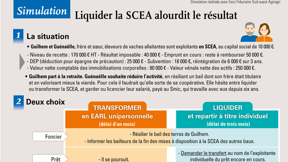 Dans le cas d'un retour à une exploitation individuelle, la société doit être d’abord être dissoute puis liquidée. Dès lors, tous les contrats (de travail, d’assurance, de prêt, etc) sont résiliés. Il faut donc obtenir des bailleurs de nouveaux baux, et informer les bailleurs de l’associé restant de la fin des mises à disposition. D’autre part, il faut obtenir l’accord de la banque pour rembourser par anticipation les emprunts ou les faire reprendre par l’exploitation individuelle. Il n’est pas possible de justifier de sa sortie d’une coopérative avant la fin de l’engagement pour cause de liquidation volontaire (seule une liquidation judiciaire le permet). « Tous les éléments du bilan doivent être évalués à la valeur du marché (et non à la valeur nette comptable) pour être repris par celui qui poursuivra l’activité, ce qui peut engendrer des plus-values ou encore une soulte à l’associé sortant», rappelle-t-il.