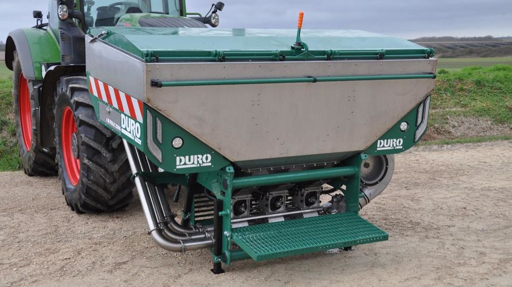 Apporter trois produits, à trois dosages différents, c’est désormais possible avec la trémie frontale Eole de Duro. Les modèles pressurisés tout Inox de 1 700 et 2 300 litres peuvent désormais être équipés de trois doseurs et trois sorties. Placés sous la trémie à triple compartimentation, les trois corps de dosage sont en inox. Ils sont entraînés en direct par un motoréducteur.