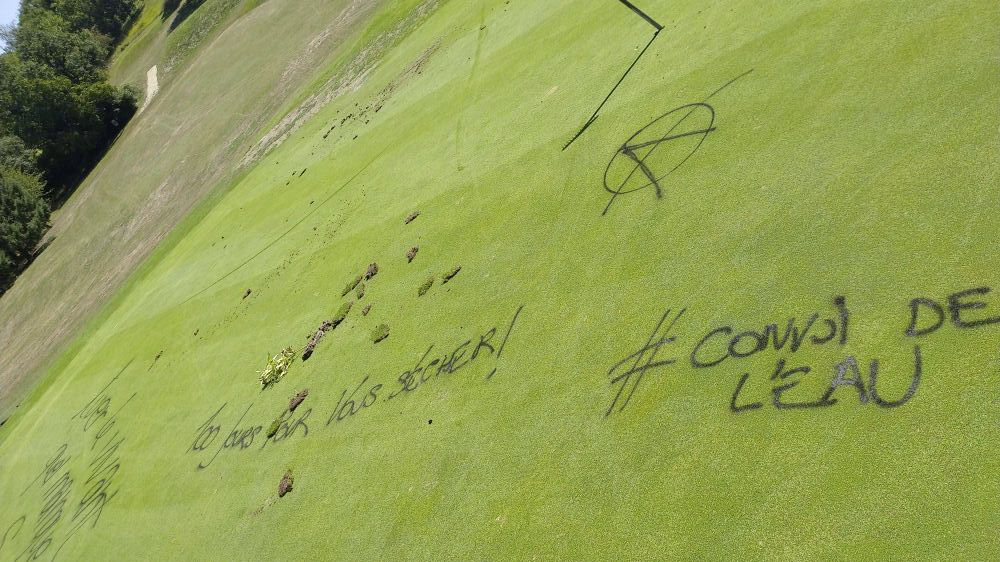 À la mi-journée, une quarantaine d’individus, certains masqués, ont cisaillé un grillage et pénétré dans ce golf situé à Beaumont-Saint-Cyr, à 20 kilomètres au nord-est de Poitiers, détériorant un green et un système d’irrigation, ont fait savoir les autorités. La préfecture de la Vienne a diffusé sur Twitter, rebaptisé X, des photos montrant des morceaux de pelouse arrachés et des slogans peints au sol, comme « 100 jours pour vous sécher » ou « #Convoi de l’eau ». On pouvait aussi distinguer, tracé au sol, un logo des Soulèvements de la Terre, collectif qui coorganise le cortège et dont la dissolution prononcée par le gouvernement a été suspendue en justice.