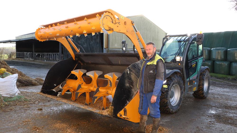 Pour cela, le télescopique est équipé d’un système de pesée, permettant au préparateur du mélange de réaliser une ration précise. Le godet Emily de 3,4 m³ est doté de trois fonctions hydrauliques, commandées avec une électrovanne. La première pilote la fraise, pour dessiler les silos ; la seconde s’occupe du mélange, facilité par des brins courts avec une coupe à l’ensileuse. La troisième gère le déchargement, avec une trappe coordonnée à l’action des pales, pour une meilleure précision.