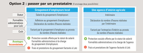 L’exploitation doit signer un contrat de mise à disposition avec le GE. Les agences de travail temporaire (intérim) proposent aussi de la main-d’œuvre et se chargent de rédiger le contrat de mise à disposition avec l’exploitant agricole. Ce dernier n’a qu’à déclarer le nombre d’heures travaillées par l’intérimaire.
