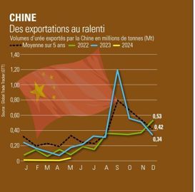 Les exportations chinoises d’urée sont limitées depuis le renforcement en septembre 2023 des inspections douanières. Le gouvernement chinois est intervenu après une baisse des stocks en 2023, afin de contrôler la hausse des prix intérieurs de l’urée. En effet, les exportations ont augmenté l’an passé de 50 % sur un an pour atteindre 4,3 millions de tonnes (Mt). De plus, la demande domestique s’est elle aussi dynamisée, entre l’adoption de nouvelles technologies d’irrigation et l’augmentation des surfaces cultivées.