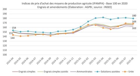 L’AGPB indique par ailleurs que 75 % des achats ont été réalisés entre avril et juin 2025 en vue de la campagne suivante. Or, d’après les indices de prix d’achat des engrais publiés par l’Insee (1) , « c’est sur cette même période que les prix de la plupart des principaux engrais marquent une hausse notable », souligne l’association spécialisée de la FNSEA. Elle explique qu’elle utilisera ces données « terrain » dans le cadre de sa « mobilisation auprès des instances françaises et européennes pour défendre l’accès à des engrais compétitifs ».