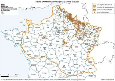 « À la suite de l’évolution de la maladie sur le territoire (voir la carte ci-dessous), le ministère de l’Agriculture et de la Souveraineté alimentaire a décidé d’étendre la zone de vaccination des ovins et des bovins contre la FCO-3, prise en charge à 100 % par l’État, à l’ensemble de la Région Bretagne », annonce le ministère de l’Agriculture, dans un communiqué de presse publié le jeudi 19 septembre 2024.
