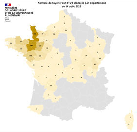 Entre le 7 et le 14 août 2025, la FCO-3 a été repérée dans cinq nouveaux départements : la Seine-Maritime, la Meurthe-et-Moselle, l’Allier, le Lot-et-Garonne et la Seine-et-Marne.