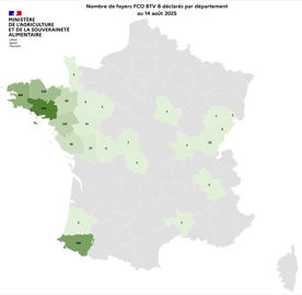 Le sérotype 8 de la FCO est, quant à lui, présent sur le territoire métropolitain depuis 2015. Il a lui aussi gagné du terrain entre le 7 et le 14 août 2025, avec 309 cas supplémentaires. Les autorités sanitaires comptabilisent 1 686 foyers entre le 1er juin et le 14 août 2025, contre 1 377 au 7 août. Entre le 5 août 2024 et le 1er juin 2025, 17 038 foyers avaient été recensés.