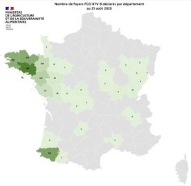 Le sérotype 8 de la FCO se diffuse également dans l’ouest de la France, dans une moindre mesure. Son évolution est moins rapide, passant à 1 938 foyers au 21 août, contre 1 686 la semaine précédente. Il touche notamment le Morbihan (503 foyers) et les Pyrénées-Atlantiques (352 foyers).