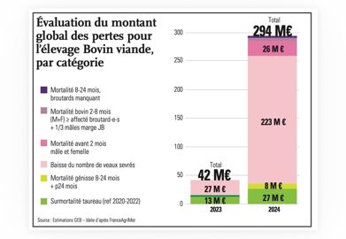 Pour ce qui est des veaux morts à moins de 8 mois, les pertes s’élèvent à 33 millions d’euros. Au total, entre les veaux morts à plus de deux mois, les veaux non nés ou morts à moins de deux mois, et les mortalités des reproducteurs, l’élevage bovin viande a perdu 294 millions d’euros en 2024.