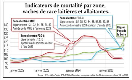 La FCO 3 a eu la particularité d’être accompagnée d’une hausse de mortalité des veaux, « qui est bien plus importante que la hausse de mortalité globale », souligne l’agroéconomiste. Pour la campagne 2024-2025, les zones touchées par la FCO 3 ont connu 43 800 morts supplémentaires de veaux entre 0 et 2 mois.