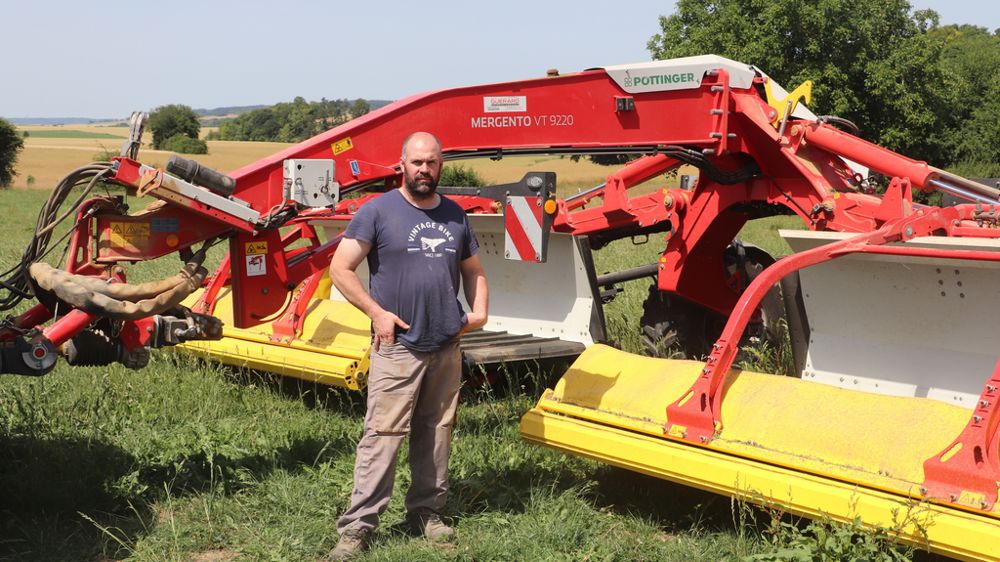 Remonter le moins de terre possible tout en préservant l’intégrité des fourrages, c’est ce qu’a décidé de faire Jean-Baptiste Douchet en changeant son andaineur mono rotor par un modèle à tapis Mergento VT 9220 de marque Pottinger. L’éleveur est, avec sa mère Françoise, à la tête du Gaec Saint Rémi. L’exploitation installée sur la commune de Blancfossé (Oise) comprend un atelier avec des vaches laitières, sur laquelle sont produits environ 1 200 000 litres de lait par an pour environ 300 bêtes et 165 hectares principalement dédiés à l’alimentation des animaux et leur paillage. « Sur ma ferme, je suis amené à andainer de la luzerne, du foin, des petits-pois de conserve, du ray-grass et des couverts. Avec mon ancien andaineur, en plus d’être limité par le débit de chantier, j’avais du mal à ramasser les feuilles de luzerne, et même bien réglé cet outil avait tendance à envoyer un peu de terre dans l’andain. C’est pour régler ces problèmes que l’andaineur à tapis est arrivé début 2024. Il travaille désormais de mi-mai jusqu’à mi-novembre. Cet andaineur fait environ 200 hectares par an, ce qui est le seuil de rentabilité que je me suis fixé pour intégrer cet outil l’exploitation. Néanmoins, je ne vais pas le cacher, il y avait aussi un petit côté plaisir à l’achat de ce matériel », indique l’éleveur.
