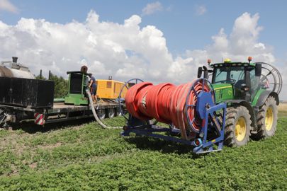 Le chantier est composé d’un binôme et de deux ensembles. Le premier est en bout de parcelle. Avec une motopompe montée sur une remorque, il gère l’approvisionnement du produit jusqu’au champ puis jusqu’au second ensemble, le tracteur qui enfouit. « Le plus souvent, on se branche sur un système de canalisations. Le débit de chantier est alors optimal. De plus il n’y a pas d’ensemble sur la route. Cela limite les nuisances et permet d’épandre avec des conditions humides sans risquer de salir la chaussée. Si cette solution n’est pas disponible, ce sont des camions qui acheminent le produit jusqu’au bord de la parcelle. »
