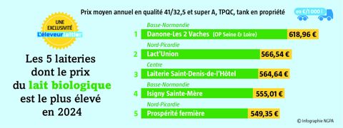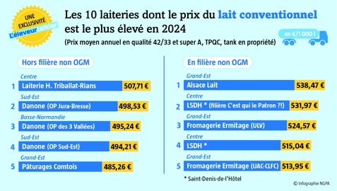 Selon le mensuel spécialisé, les laiteries appartenant à la catégorie des petites et moyennes entreprises (PME) « restent les championnes des prix du lait français les plus élevés » (voir l’infographie ci-dessous). Celles en filière non OGM continuent de tirer leur épingle du jeu à l’instar de la coopérative Alsace Lait, spécialisée en produits frais. ». Hors filière non OGM, c’est la laiterie Triballat-Rians qui monte sur la plus haute marche du podium, « grâce à ses produits haut de gamme ».