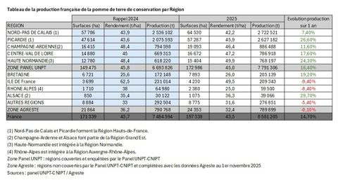 Les surfaces dédiées à la pomme de terre de conservation ont poursuivi leur progression avec + 25 % depuis 2023 et + 15 % par rapport à 2024, pour atteindre 197 338 hectares. « Au total, un million de tonnes supplémentaires pourraient avoir été récoltées pour la campagne 2025-2026 en France », estime la profession.