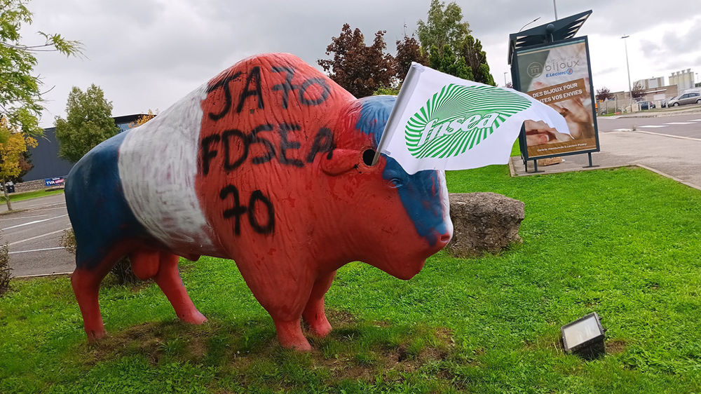 Jeudi, une cinquantaine d’agriculteurs, selon des représentants syndicaux, ont bloqué l’entrée d’un Buffalo Grill à Pusey, près de Vesoul (Haute-Saône), pour la défense de la viande française. Avec une charolaise devant la porte d’entrée, ils ont tagué sur la devanture « Je suis français, je mange français ».