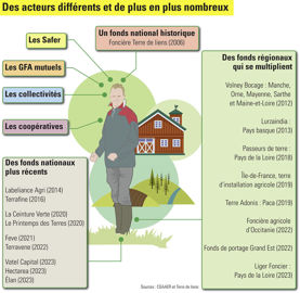 Cette multiplication des acteurs naît dans les années 2000. Le plus important aujourd’hui et qui fait désormais figure d’historique est la Foncière Terre de liens créée en 2006. Elle mobilise « l’épargne citoyenne » pour acquérir des terres et installer sur des exploitations en agriculture biologique. Au 31 décembre 2023, elle compte 322 fermes en activité, 9 900 hectares acquis et 162 millions d’euros de fonds levés.